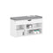 Under the seat, two cubes with doors and storage compartment in middle with adjustable shelf provide large storage space for shoes, etc.