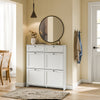 [Durable and Safe]: Constructed from E1 MDF with a smooth, durable surface, this shoe storage cabinet is built to last. Equipped with a tilt-proof device and silicone feet to protect your floors, it ensures both safety and stability.